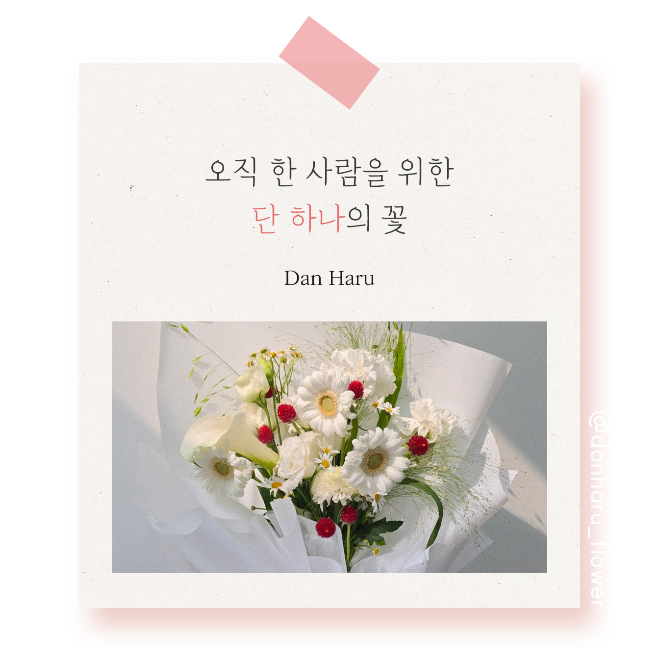 단 하루는 국제 플라워 디자이너 협회(AIFD) 자격을 보유한 전문 플로리스트가 운영하는 꽃집으로, 세계적으로 공인된 디자인 감각과 섬세한 감성을 바탕으로 특별한 순간을 더욱 아름답게 완성합니다. 꽃다발과 부케는 물론, 성전 꽃꽂이와 이벤트 플라워까지 각자의 스토리에 맞춰 정성껏 디자인해드립니다. 단순히 꽃을 전하는 것이 아니라, 그날의 감정과 의미를 담아 하나의 작품으로 만들어내는 공간입니다.
